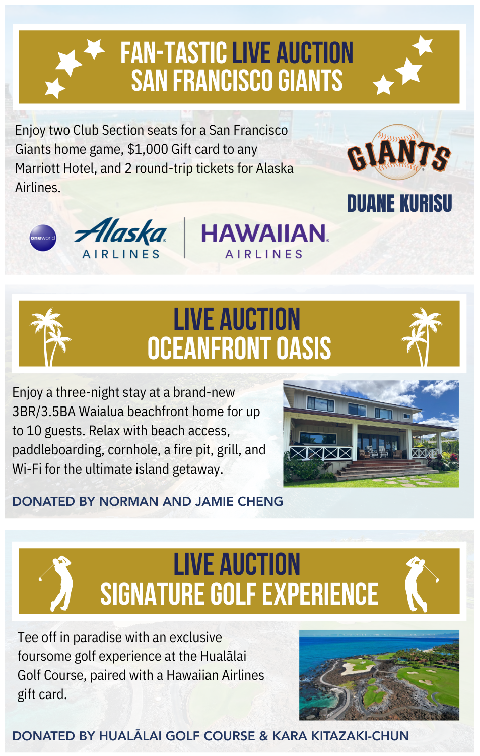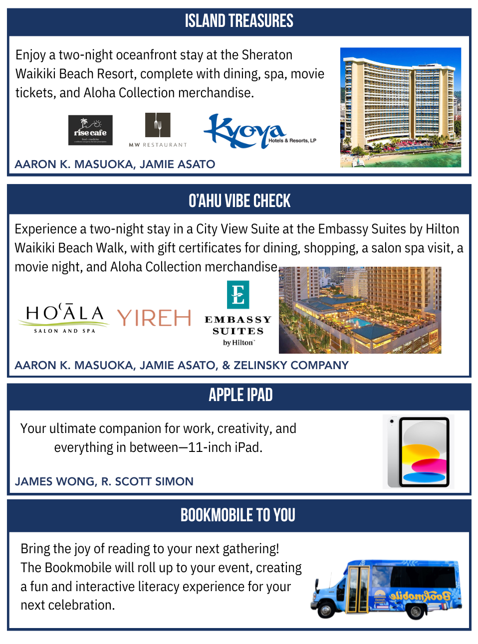 Reserved tables, program ads, web and social media promotion, and other great benefits are available for our valued sponsors. Please view information for sponsorship below OR CLICK HERE for all the benefits included in each level of sponsorship. Mahalo for your consideration & support!